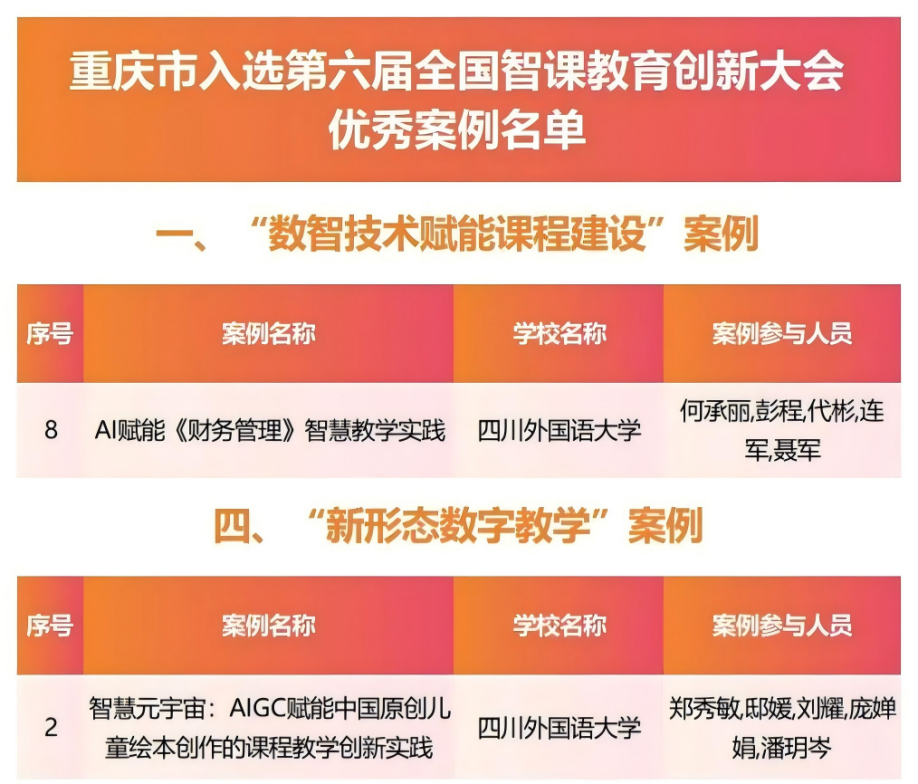 何承丽老师团队申报的“AI赋能《财务管理》智慧教学实践”案例成功入选“数智技术赋能课程建设”案例。该案例立足教学实践长期深入探索人工智能与财务管理教学的融合,初步构建了“内容—方法—场景—评价”四位一体的智慧教学新范式,形成了可复制、可推广的智慧教学方案,有力支撑了“财务管理”国家级一流专业建设点的质量提升与内涵发展。同时,该案例也是学院荣获重庆市教学成果奖二等奖的重要实践基础之一,体现了学校在新文科改革方面的持续创新与初步成效,为财经类课程的智慧化转型提供了具有示范意义的“川外方案”。
