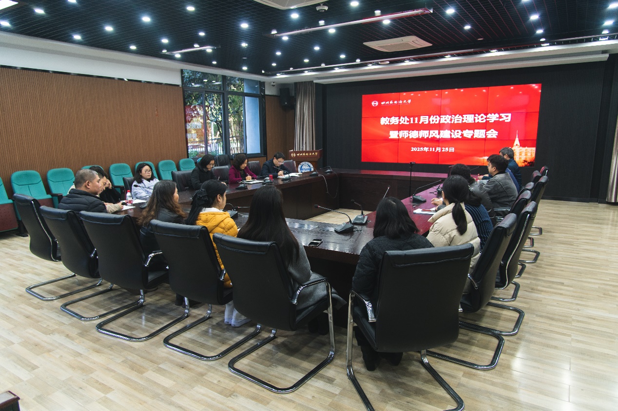 11 月 25 日下午,按照学校统一部署,教务处组织开展 11 月教职工政治理论学习暨师德师风建设专题会。教务处全体教职工参加学习讨论,党委巡察办公室魏家伟同志到会巡听。